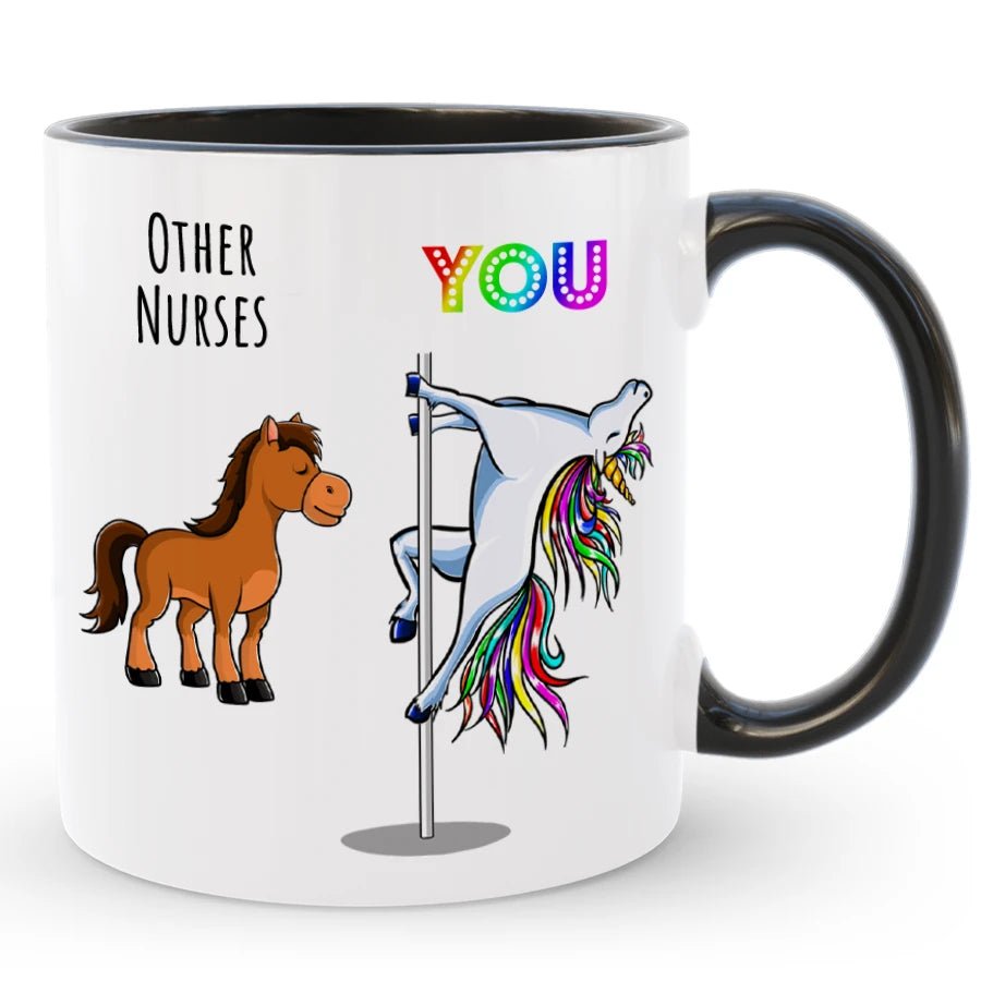The perfect nurse appreciation gift with our custom funny nurse mug! Personalized with a name, it’s a hilarious nurse gag gift featuring a unicorn dancing on a pole. Ideal for showing appreciation to the best nurse ever.