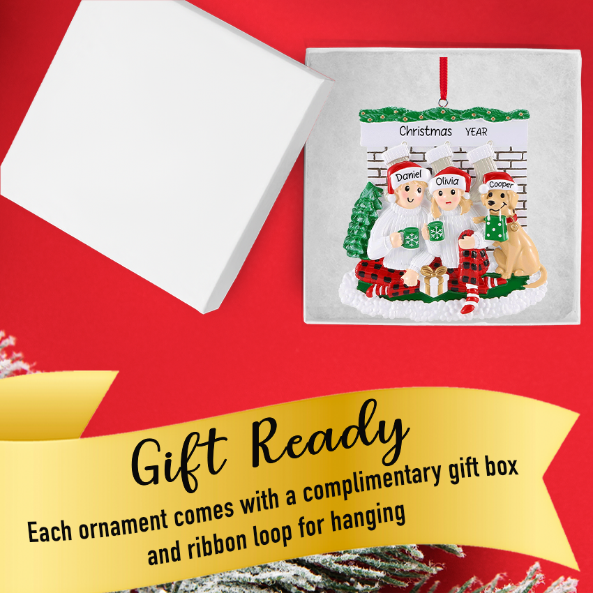 Personalized Fireplace Couple with Dog Christmas Ornament