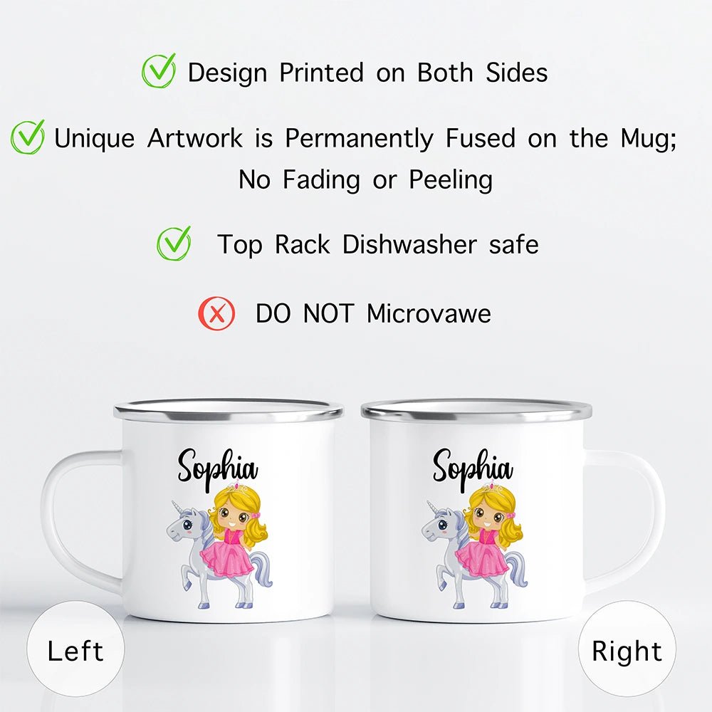 A personalized kids mug crafted from shatterproof enamel-coated stainless steel with vibrant double-sided design and free name customization.